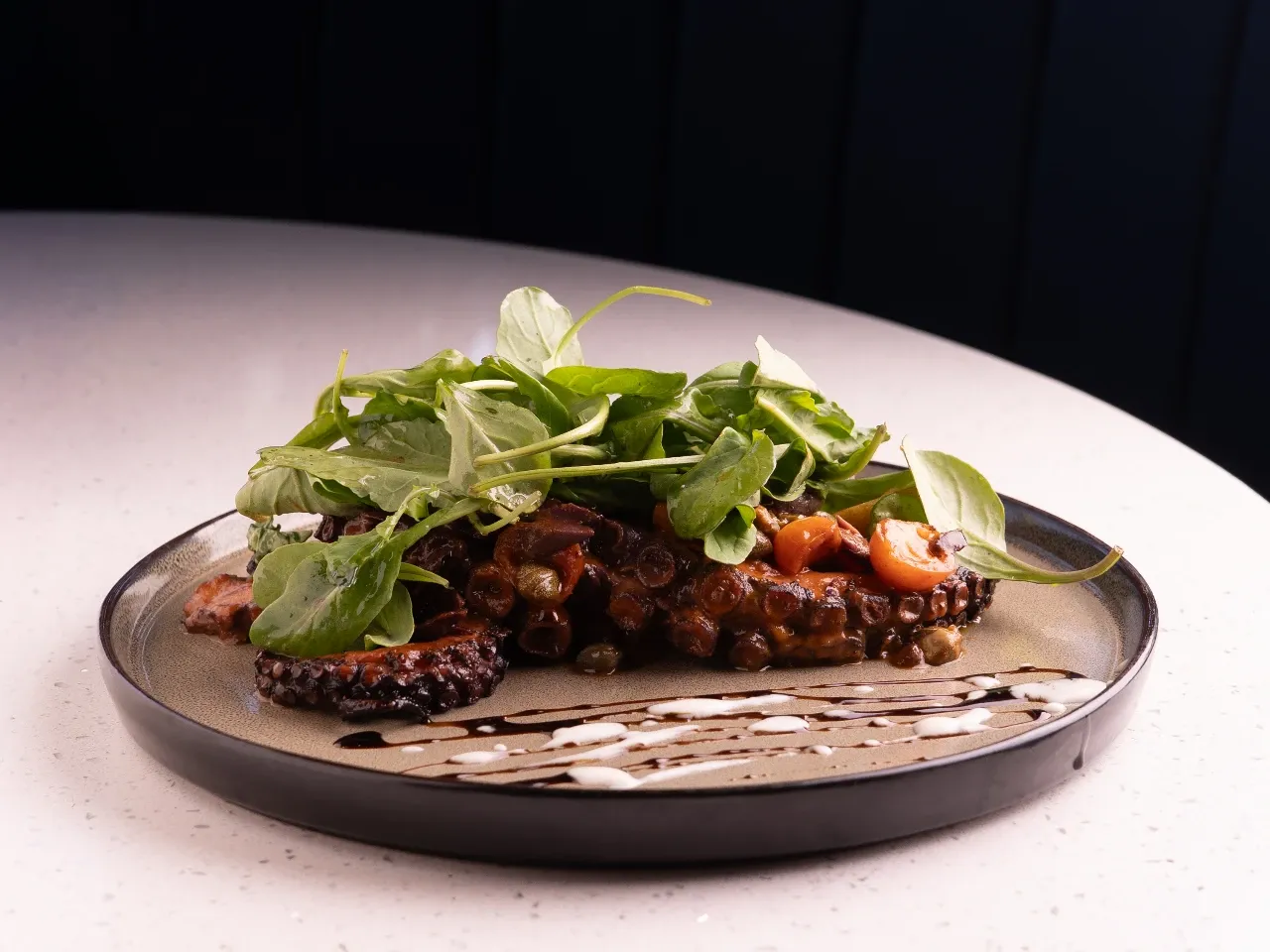 Tibia ensalada con tentáculos de pulpo marinado en casa, papas confitadas, berros hidroponicos y salsa fria de palmitos