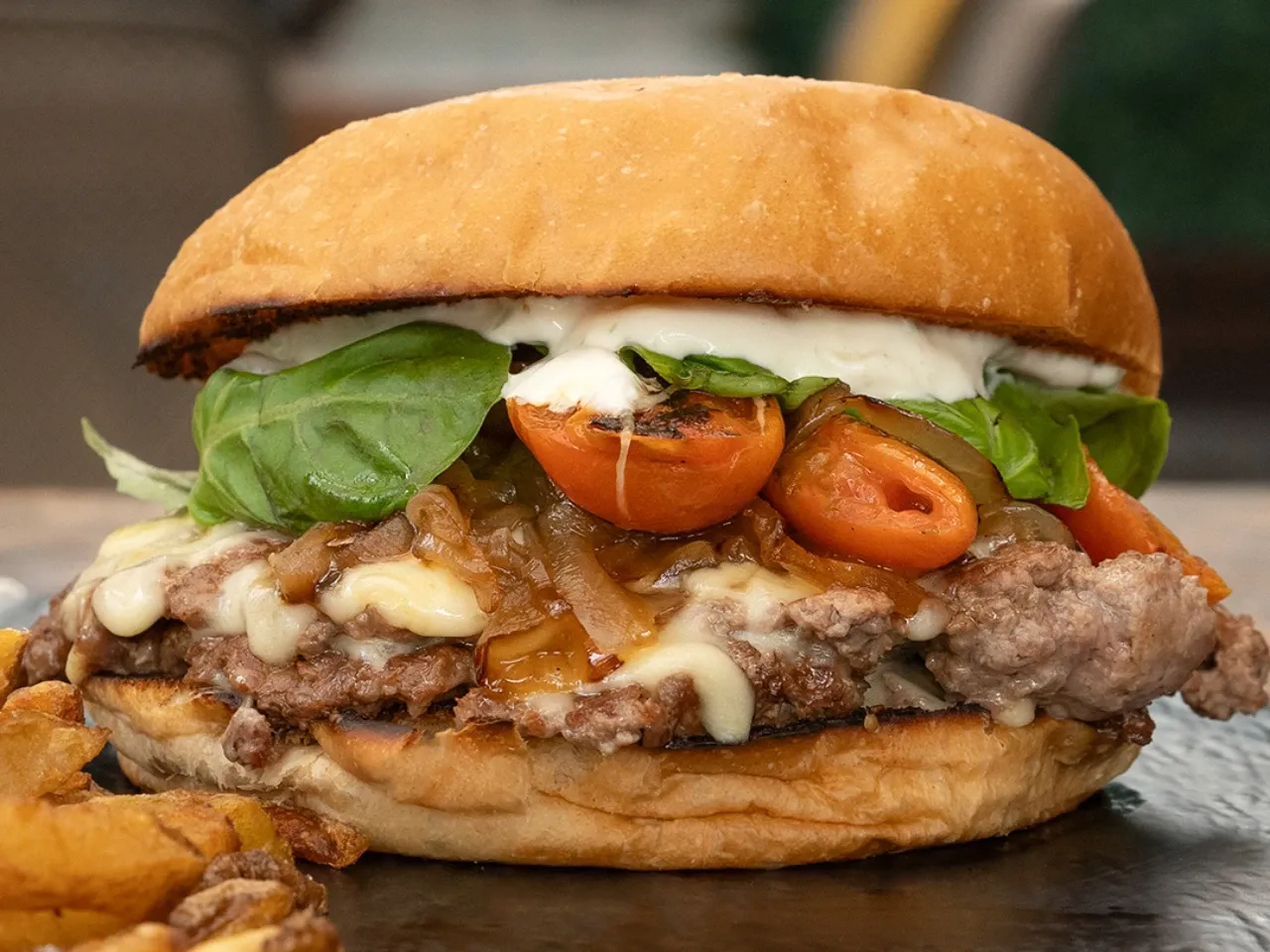 Pan brioche, doble smash burger (200 grs), queso mozzarella, tomate cherry asado, albahaca, cebolla caramelizada y mayonesa zamai. Acompañado de papas de la casa.