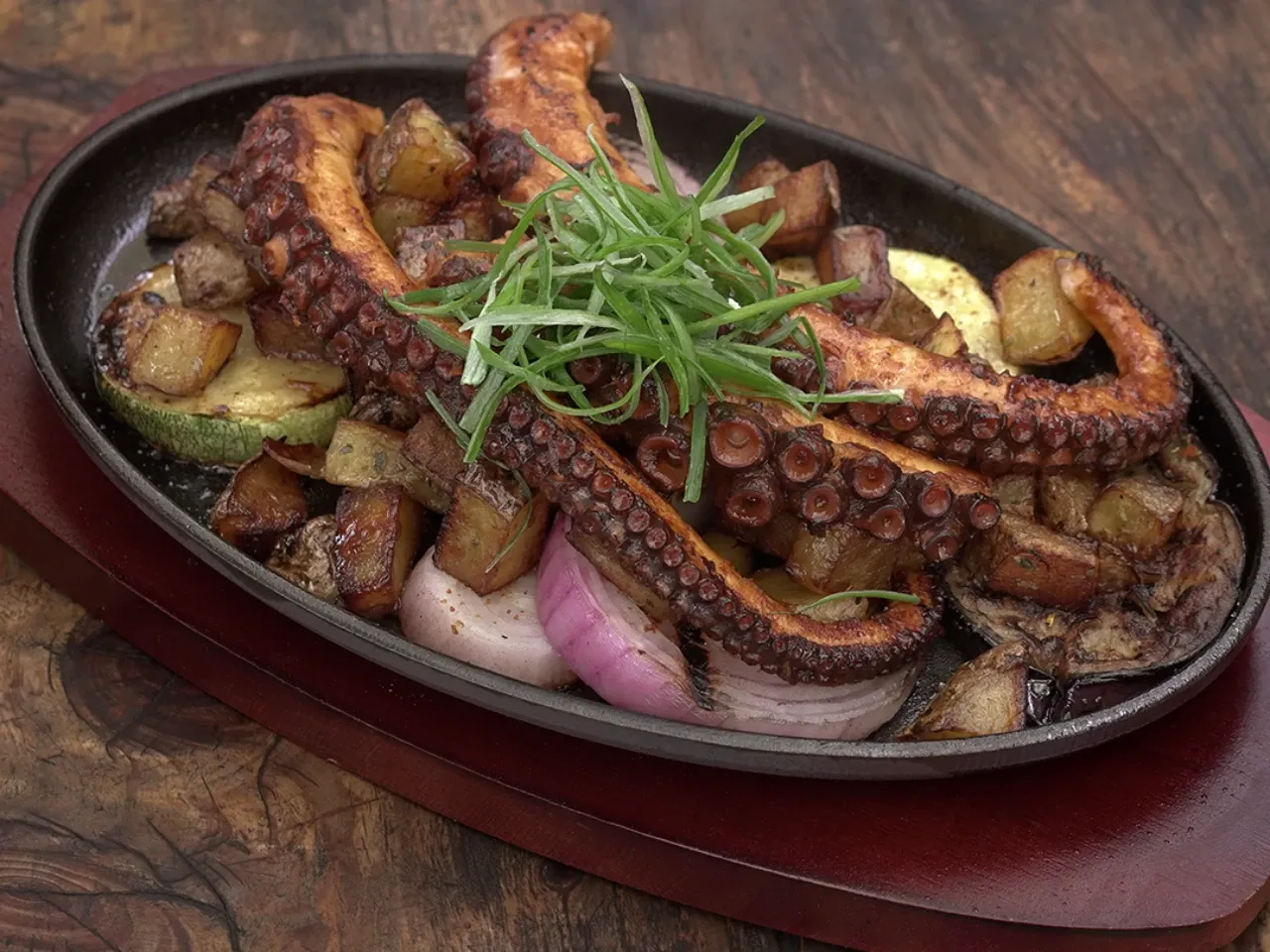 Tentáculos de pulpo dorados a la plancha, servidos sobre una cama de zapallo italiano, berenjena asada y papas.